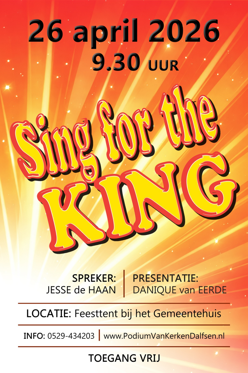‘Sing for the KING’ is een interkerkelijke Sing-in in Dalfsen die voor jong en oud gehouden wordt in de tent van de Oranjefeesten op zondagmorgen 26 april 2026, aanvang 9.30 uur.